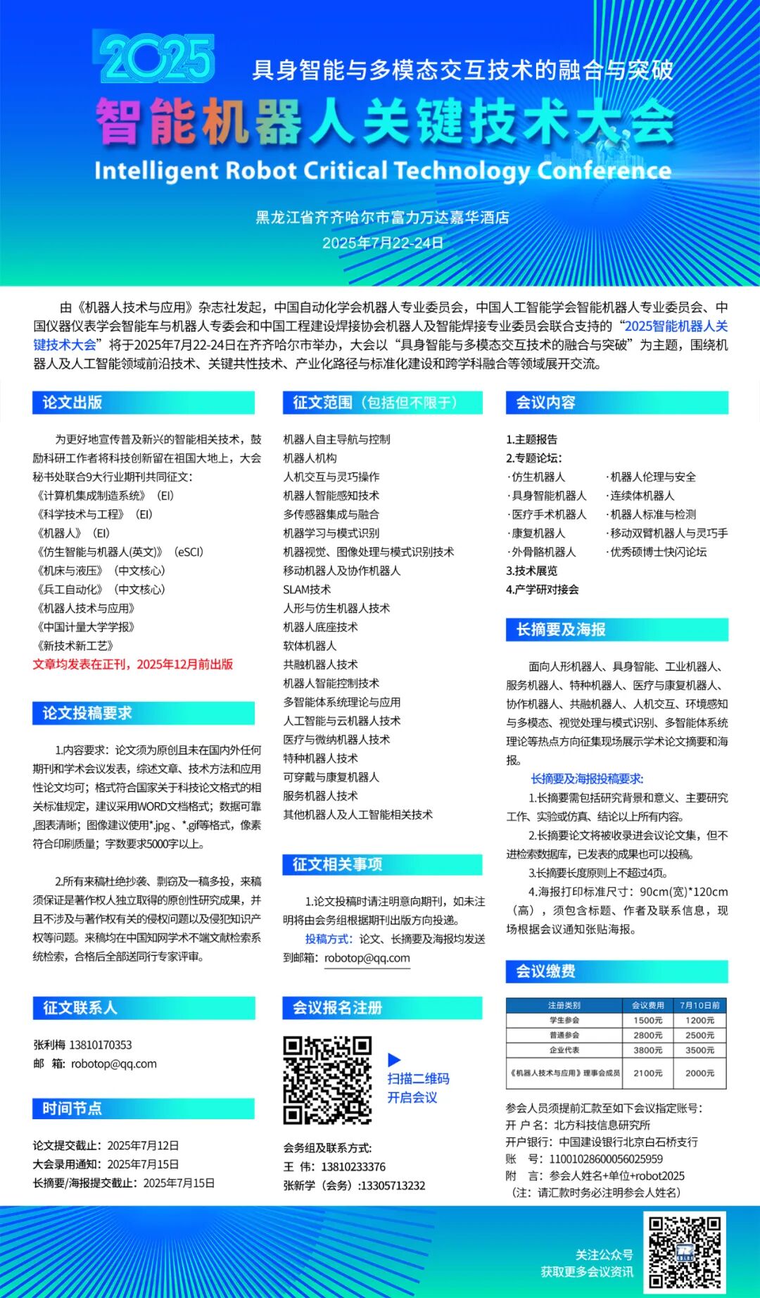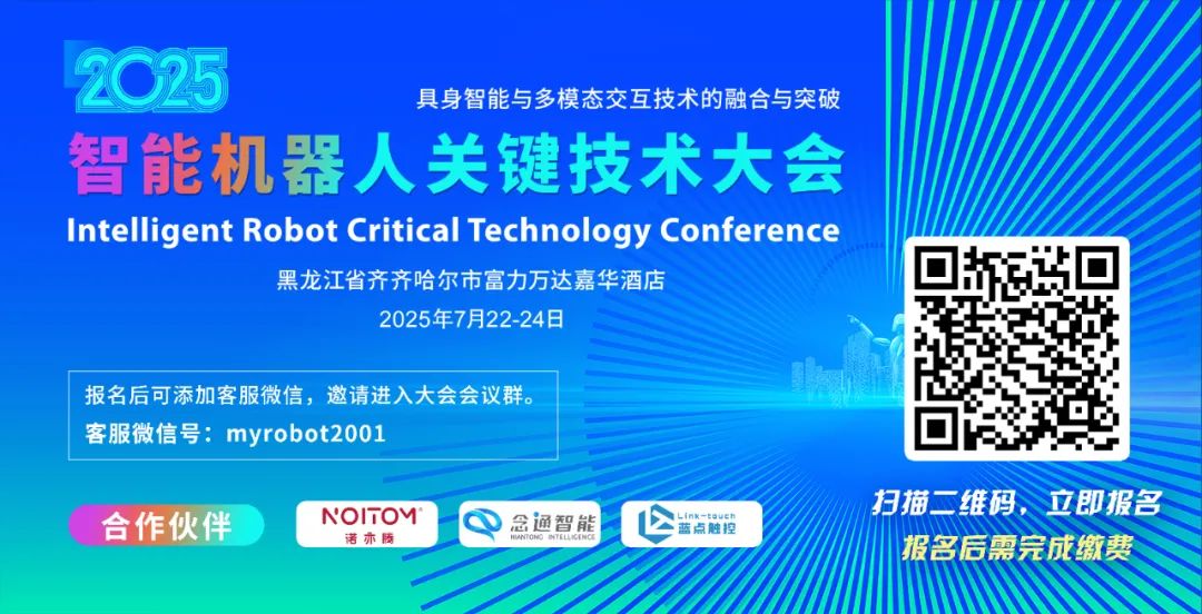 由《機(jī)器人技術(shù)與應(yīng)用》雜志社發(fā)起,中國自動(dòng)化學(xué)會機(jī)器人專業(yè)委員會,中國人工智能學(xué)會智能機(jī)器人專業(yè)委員會、中國儀器儀表學(xué)會智能車與機(jī)器人專委會和中國工程建設(shè)焊接協(xié)會機(jī)器人及智能焊接專業(yè)委員會聯(lián)合支持的“2025智能機(jī)器人關(guān)鍵技術(shù)大會”將于2025年7月22-24日在齊齊哈爾市舉辦,大會以“具身智能與多模態(tài)交互技術(shù)的融合與突破”為主題,圍繞機(jī)器人及人工智能領(lǐng)域前沿技術(shù)、關(guān)鍵共性技術(shù)、產(chǎn)業(yè)化路徑與標(biāo)準(zhǔn)化建設(shè)和跨學(xué)科融合等領(lǐng)域展開交流。