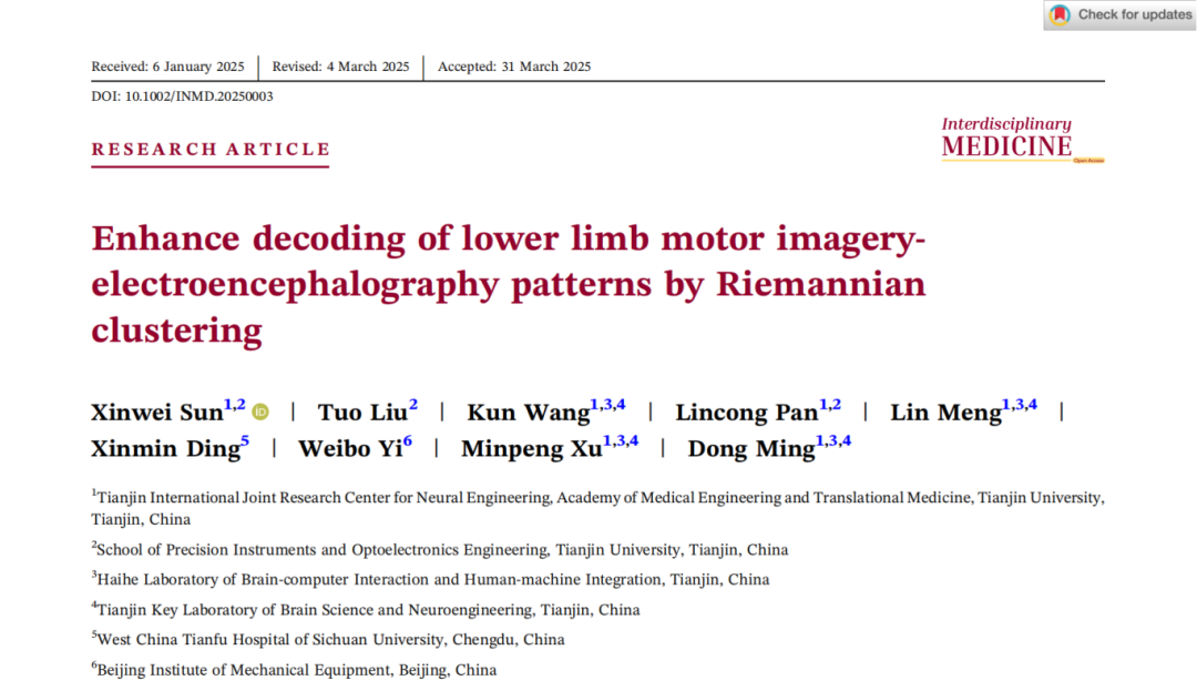 據了解,上述研究成果以《Enhance decoding of lower limb motor imagery‐electroencephalography patterns by Riemannian clustering》為題,發表于神經科學與醫學交叉領域的頂級國際學術期刊《Interdisciplinary Medicine》(IF:13.6,中科院一區期刊)。該項研究得到國家重點研發計劃、國家自然科學基金等項目的資助支持。團隊碩士研究生孫新維、劉拓為論文共同第一作者,許敏鵬教授、王坤副教授為共同通訊作者。研究論文已在線發表并開放獲取(DOI:10.1002/INMD.20250003)。