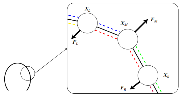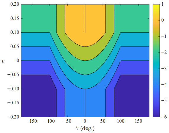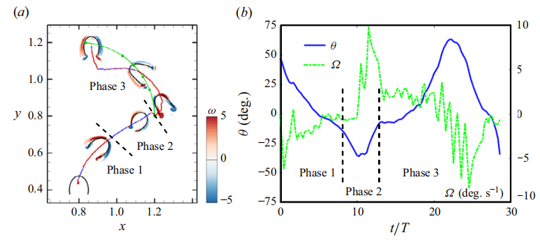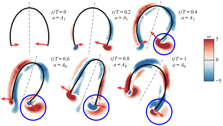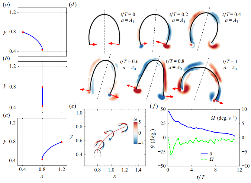 圖2:類水母模型游動體由159個拉格朗日點構成。相鄰兩點間通過彈簧連接(黑色實線表示),每三個相鄰點間通過梁單元連接(黑色虛線表示)。不同顏色對應不同梁單元。右圖展示了三個相鄰點構成的離散纖維梁模型:紅色虛線表示梁單元,三個圓點代表梁模型的左(X_L)、中(X_M)、右(X_R)三個相鄰點,其位移矢量分別記為X_L、X_M、X_R,對應的拉格朗日力分別為F_L、F_M、F_R。圖3:獎勵函數(shù)r(s,a)的等高線圖(典型參數(shù):A=20,B=10,d=0.1)圖4:(a-c) 游動體追蹤固定目標(左前方、正前方和右前方)的運動軌跡,紅點表示起點和目標點。(d) 配備動作調節(jié)機制的游動體右轉過程(t/T=0, 0.2, 0.4, 0.6, 0.8, 1時刻的渦量幅值等高線圖),動作序列為A1、A3、A0、A0。(e) 游動體追蹤右前方目標時的運動軌跡及渦量幅值等高線圖。(f) 追蹤右前方目標過程中θ角和Ω角速度的時序變化。圖5:無動作調節(jié)機制的游動體右轉過程。(t/T=0、0.2、0.4、0.7、0.8、1時刻的渦量幅值等高線圖)。動作序列為A1、A1、A0、A0,其中第二拍施加非對稱作用力。不同拍次產(chǎn)生極性相反的尾渦(藍圈標示區(qū)域),這些渦流相互抵消導致推進效率下降。圖6: (a) 游動體質心運動軌跡(紅藍線)與移動目標軌跡(綠線)。紅色與藍色線段分別表示施力與未施力狀態(tài)下的動作。六個時間點的瞬時狀態(tài)展示包括:游動體形態(tài)(黑色曲線)、周圍渦量分布(彩色等高線)及目標點位置(綠點)。(b) 追蹤移動目標過程中θ角與Ω角速度的時序變化,圓形目標軌跡的追蹤過程詳見補充視頻1。文章小結