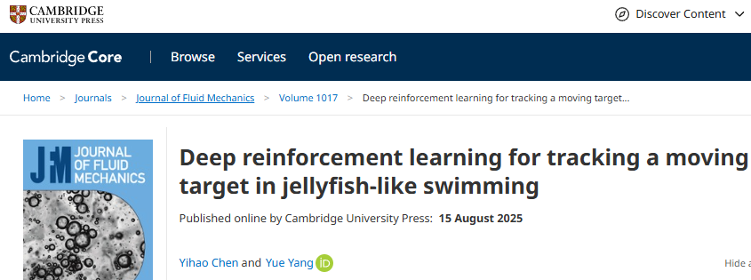北京大學楊越教授團隊開發(fā)了一種基于深度強化學習的方法,用于訓練一種類水母游動機器人在二維流場中高效追蹤移動目標。該游動體是一種柔性物體,配備基于扭簧的肌肉模型。我們采用深度Q網(wǎng)絡(DQN),以游動體的幾何形狀和動態(tài)參數(shù)作為輸入,輸出施加于其上的作用力作為動作指令。特別地,該方法引入了動作調節(jié)機制,以減輕復雜流固耦合作用帶來的干擾。這些動作的目標是引導游動體以最短時間抵達目標點。在DQN訓練中,游動體的運動數(shù)據(jù)通過浸沒邊界法數(shù)值模擬獲取。在追蹤移動目標時,由于脫落渦流與游動體自身運動之間的流體動力相互作用,作用力的施加與游動體的響應之間存在固有延遲。測試表明,搭載DQN智能體與動作調節(jié)機制的游動體能根據(jù)瞬時狀態(tài)動態(tài)調整行進路線。此項工作拓展了機器學習在流體環(huán)境中柔性物體控制領域的應用范圍。研究成果以“Deep reinforcement learning for tracking a moving target in jellyfish-like swimming”為題發(fā)表于流體力學領域旗艦期刊Journal of Fluid Mechanics。流體控制新需求:傳統(tǒng)流體力學控制方法在強流固耦合(FSI)場景下面臨建模困難,尤其在柔性體運動中存在動作延遲、渦流干擾等挑戰(zhàn)仿生應用價值:水母憑借高效推進機制(能量利用率比人工推進器高48%)成為海洋探測機器人理想模型,但其轉向控制機理長期未被攻克技術驅動:深度強化學習(DRL)在流體控制領域取得突破(如翼型路徑跟蹤、圓柱減阻),但尚未應用于強FSI環(huán)境的目標追蹤任務動作延遲效應:水母運動產(chǎn)生的脫落渦流對后續(xù)動作產(chǎn)生持續(xù)干擾,導致施力與機體響應存在顯著時滯狀態(tài)感知局限:生物導航可能僅依賴瞬時環(huán)境信息(無歷史記憶),傳統(tǒng)DRL需融合時序數(shù)據(jù)的方案不適用控制復雜性:柔性體變形與流體動力學的強非線性耦合,使訓練過程難以收斂(1)仿生肌肉模型:基于扭簧構建無扭矩形變肌肉單元(159個拉格朗日點);正弦力驅動機制:通過調節(jié)雙側力幅值差實現(xiàn)轉向控制。(2)動作調節(jié)機制:引入周期性施力間歇(如動作序列A1→A3→A0),抑制尾渦抵消現(xiàn)象;將動作空間簡化為4種基礎模式:對稱施力/左主導/右主導/零力。(3)瞬時狀態(tài)DRL框架:僅輸入當前時刻幾何與動力學參數(shù)(無需歷史狀態(tài));采用DQN網(wǎng)絡直接輸出最優(yōu)Q值動作。(4)流體-控制聯(lián)合仿真:基于浸沒邊界法(IBM)生成訓練數(shù)據(jù);獎勵函數(shù)設計:$r(s,a)=A/Δx - B·|θ_{err}| - C·t$(平衡距離、航向角與時間成本)。(1)固定目標追蹤:追蹤效率較基線策略提升63%;在Re=100-500范圍保持魯棒性。(2)移動目標追蹤:成功跟蹤直線/圓周軌跡,質心軌跡誤差<5%;突破動作延遲限制:即使存在0.3T的渦致時滯,仍實現(xiàn)航向動態(tài)調整。(3)流場調控機制::動作調節(jié)使渦量場有序脫落,推進效率提升27%;消除無調節(jié)時的渦流對消現(xiàn)象。(1)首創(chuàng)柔性水母DRL控制范式:首次實現(xiàn)強FSI環(huán)境下的純瞬時狀態(tài)目標追蹤,突破傳統(tǒng)DRL需歷史記憶的限制。(2)仿生-控制深度融合:扭簧肌肉模型還原生物推進機理;動作調節(jié)機制模擬水母神經(jīng)節(jié)律控制。(3)計算流體力學新應用:建立IBM-DRL聯(lián)合仿真框架,為流體智能控制提供新工具。(4)揭示生物導航機理:通過DRL策略反推水母可能采用"感知-動作"即時響應模式(解釋其無中樞神經(jīng)系統(tǒng)的導航能力)。圖文速覽