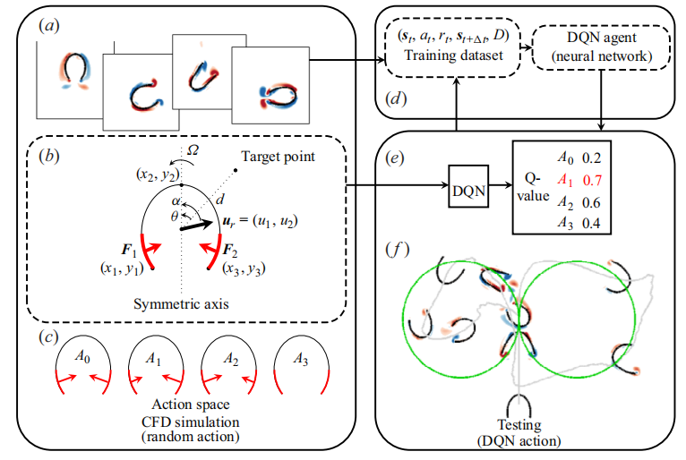 圖1:整體工作流程示意圖。(a) 通過多組仿真數(shù)據(jù)獲取離線訓練樣本。(b) 類水母游動體的幾何構型與狀態(tài)參數(shù),紅色區(qū)域標示作用力施加部位。(c) 包含四種動作(A_i,i = 0,1,2,3)的動作空間,分別表征典型水母運動模式(從左至右):兩側對稱施力、右側主導施力、左側主導施力、零施力狀態(tài)。(d) 隨機動作的多組仿真(左側虛線框)與經(jīng)驗元組(s_t, a_t, r_t, s_{t+Δt}, D)采集過程(右側虛線框)。(e) DQN模塊接收狀態(tài)向量并輸出各動作Q值,最終選擇Q值最高的動作。(f) 經(jīng)訓練后的智能體在不同追蹤任務中的測試效果,補充視頻1-2展示了游動體追蹤移動目標的動態(tài)過程。