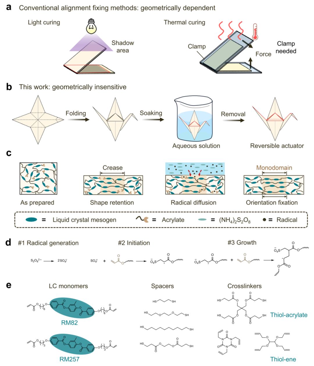 圖1 揭示了傳統方法與新策略的差異:光固化受陰影區限制(圖1a),熱固化需夾具維持拉伸(圖1a);而新方法通過折疊LCE并浸泡APS溶液(圖1b),自由基擴散觸發殘留丙烯酸酯交聯(圖1d),永久鎖定折痕處的介晶取向(圖1c)。實驗證明,含丙烯酸酯的LCE(如RM82單體)是實現該過程的關鍵(圖1e)。