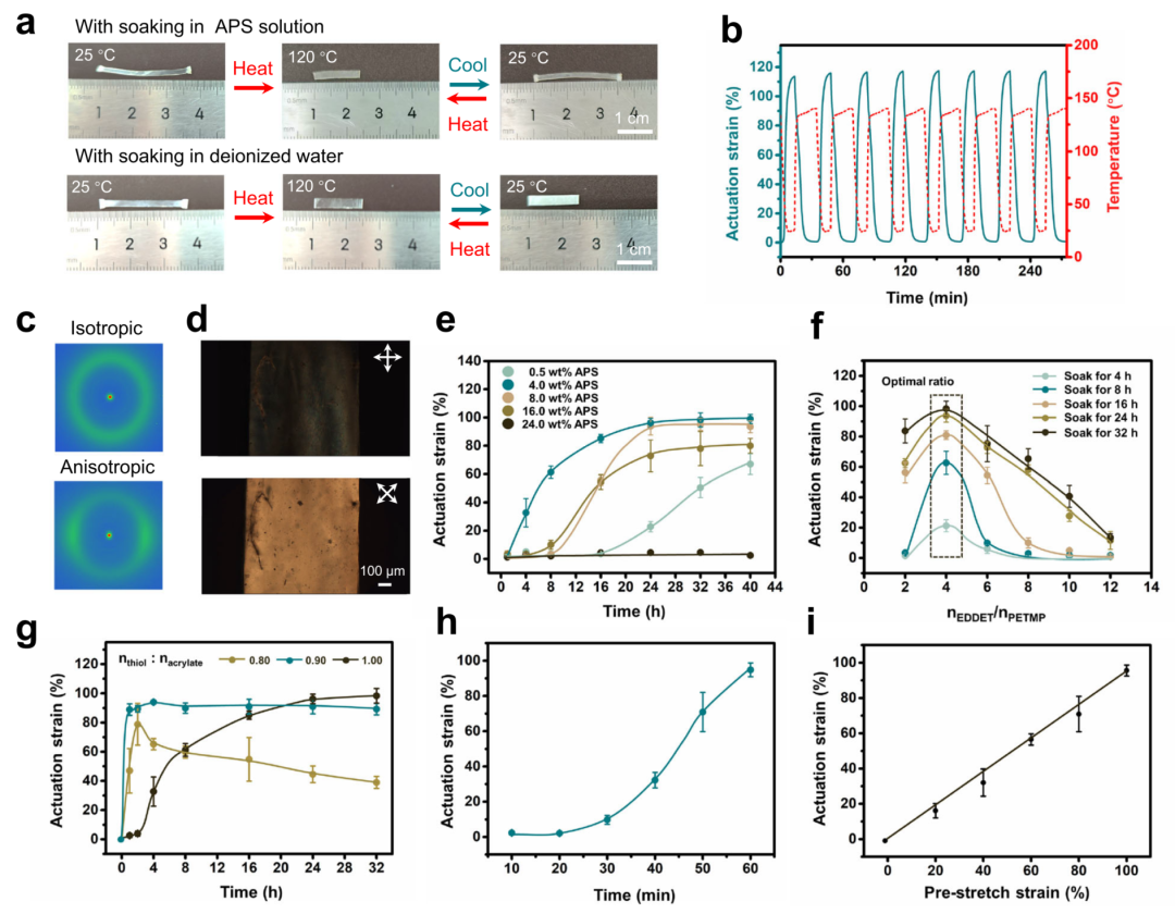 圖3 | LCE驅動性能 (a) APS溶液與去離子水處理的LCE驅動應變對比。 (b) 加熱/冷卻循環下的可逆驅動行為。 (c) 編程前后WAXD圖案(各向同性環→各向異性弧)。 (d) 排列LCE的偏光顯微鏡圖像。 (e) 驅動應變與APS濃度/浸泡時間的關系。 (f) 驅動應變隨交聯劑含量與浸泡時間的變化。 (g) 殘留丙烯酸酯含量對驅動應變的影響。 (h-i) 驅動應變與浸泡時間(h)、預拉伸應變(i)的關系。