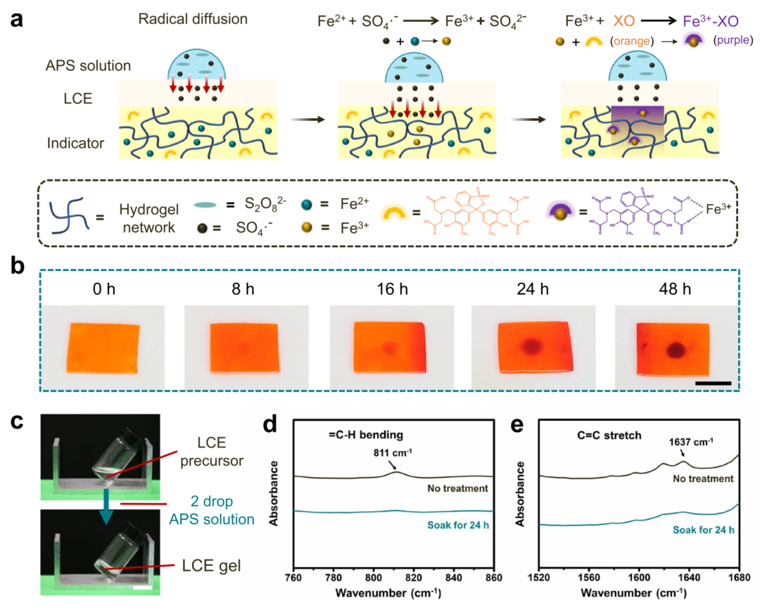 圖2 | 自由基擴散與反應機制 (a) 自由基擴散監測示意圖:硫酸根自由基(SO??)將Fe2?氧化為Fe3?,與木犀草素(XO)形成紫色復合物。 (b) 自由基擴散結果(隨時間推移出現紫色斑點)。 (c) 添加APS溶液前后LCE前體狀態(左:液態;右:凝膠化)。 (d-e) LCE薄膜浸泡APS前后的FTIR光譜(雙鍵特征峰消失)。