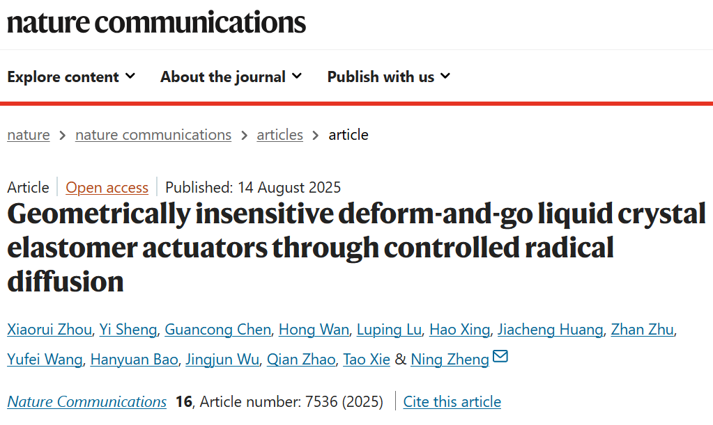 浙江大學謝濤教授、鄭寧教授團隊提出一種基于自由基擴散的“變形驅動”策略,突破了幾何形狀對LCE驅動器的制約。該方法僅需將LCE浸泡于過硫酸銨(APS)水溶液中,自由基即可自發滲透網絡并引發殘留丙烯酸酯交聯,固定變形結構與介晶排列。該過程無需外力維持、加熱或光照,適用于3D打印、折紙、模塑等任意復雜幾何結構,實現了高穩定性(140℃下循環穩定)和可逆驅動應變(最高達110%)。相關論文以“Geometrically insensitive deform-and-go liquid crystal elastomer actuators through controlled radical diffusion”為題,發表在Nature Communications上。