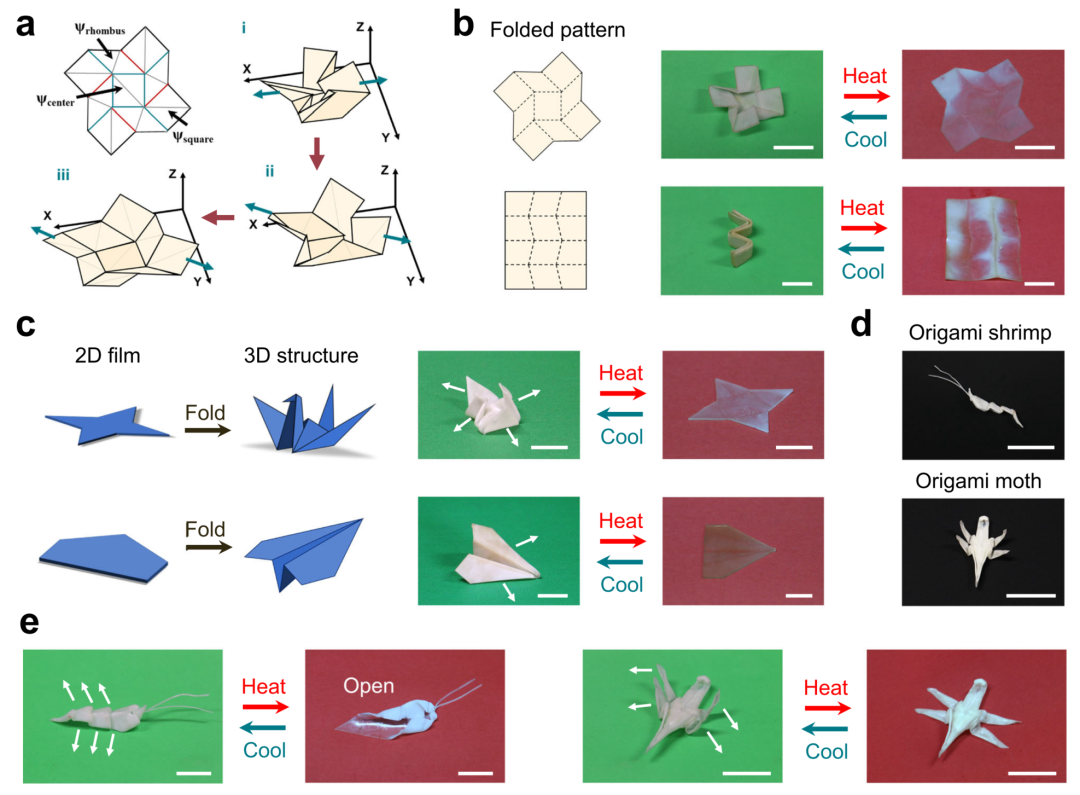 圖5 | LCE折紙 (a) 由方形/菱形面板構成的Square-Twist折紙折疊過程。 (b) 不同折紙圖案的設計與驅動行為。 (c) 千紙鶴/飛機的2D-3D可逆轉換。 (d) 多層折疊的蝦/蛾結構。 (e) 蝦/蛾的3D-3D可逆形變(白箭頭示驅動方向)。