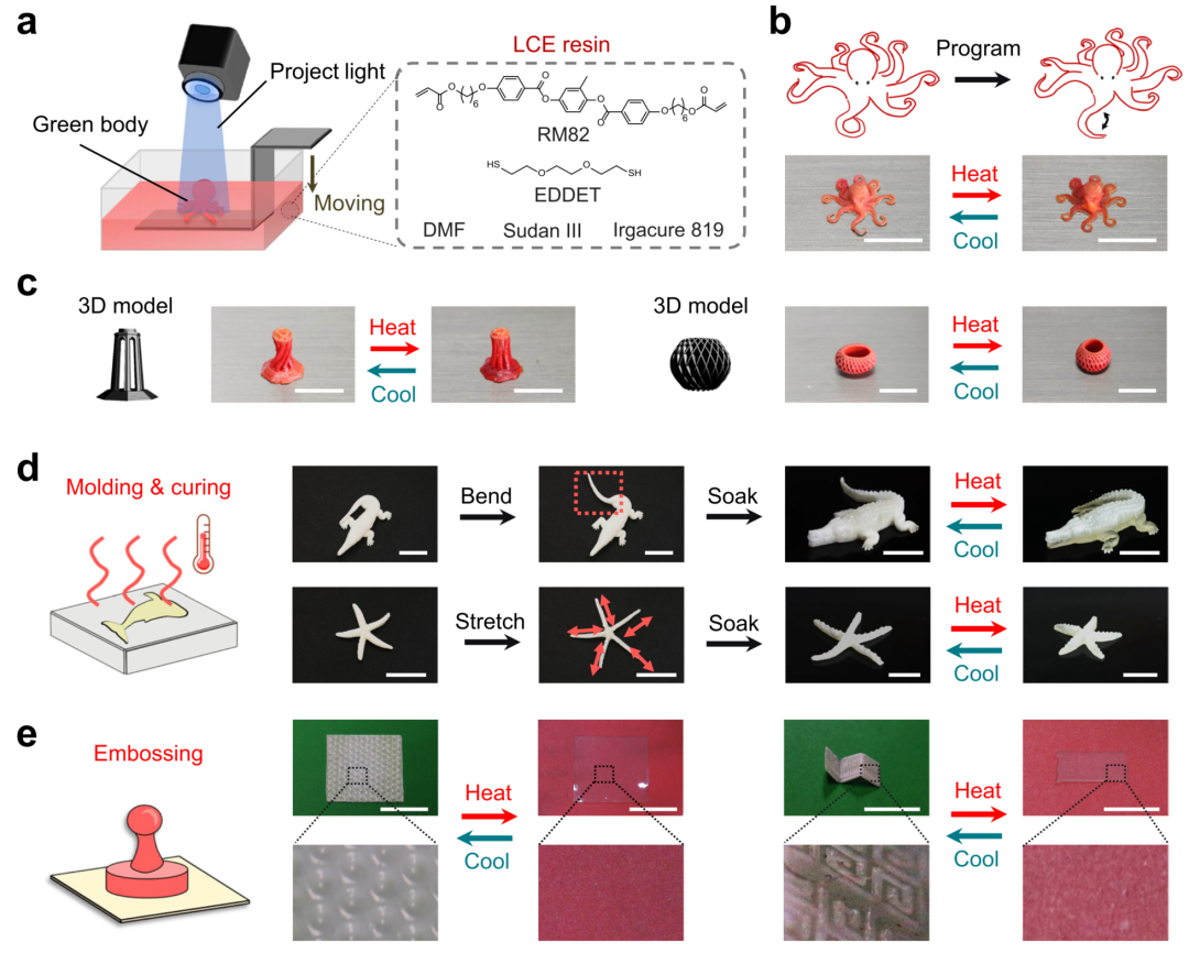 圖4 | LCE 3D結構的制造與編程 (a) DLP 3D打印裝置及LCE樹脂配方(含光引發劑Irgacure 819)。 (b) 3D打印章魚的編程與驅動行為。 (c) 打印物體的可逆驅動(浸泡24小時)。 (d) 模塑成型3D結構的驅動(箭頭示拉伸方向)。 (e) 壓印技術實現的可視化圖案可逆切換(浸泡4小時)。