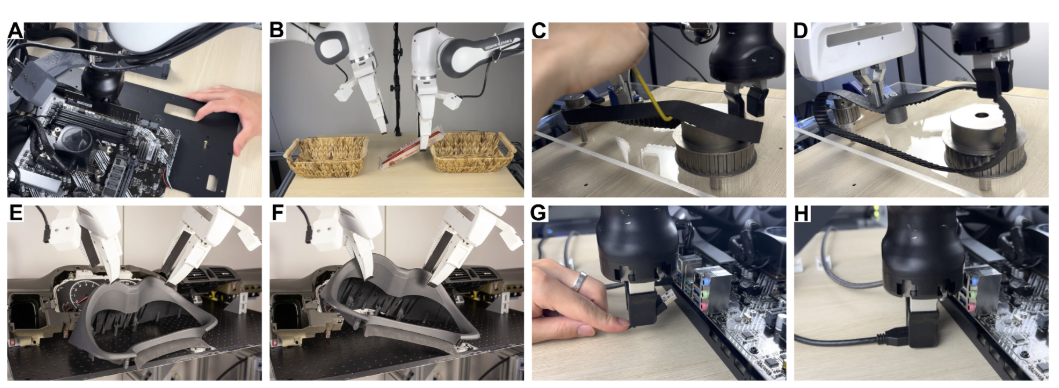 圖1.實驗任務概述。本文考慮的任務子集,包括 (A) 從塔上取出疊疊樂塊,(B) 翻轉(zhuǎn)平底鍋中的物體,以及組裝復雜的設備,例如 (C) 正時皮帶、(D) 儀表板、(E) 主板和 (F) 宜家擱板。
