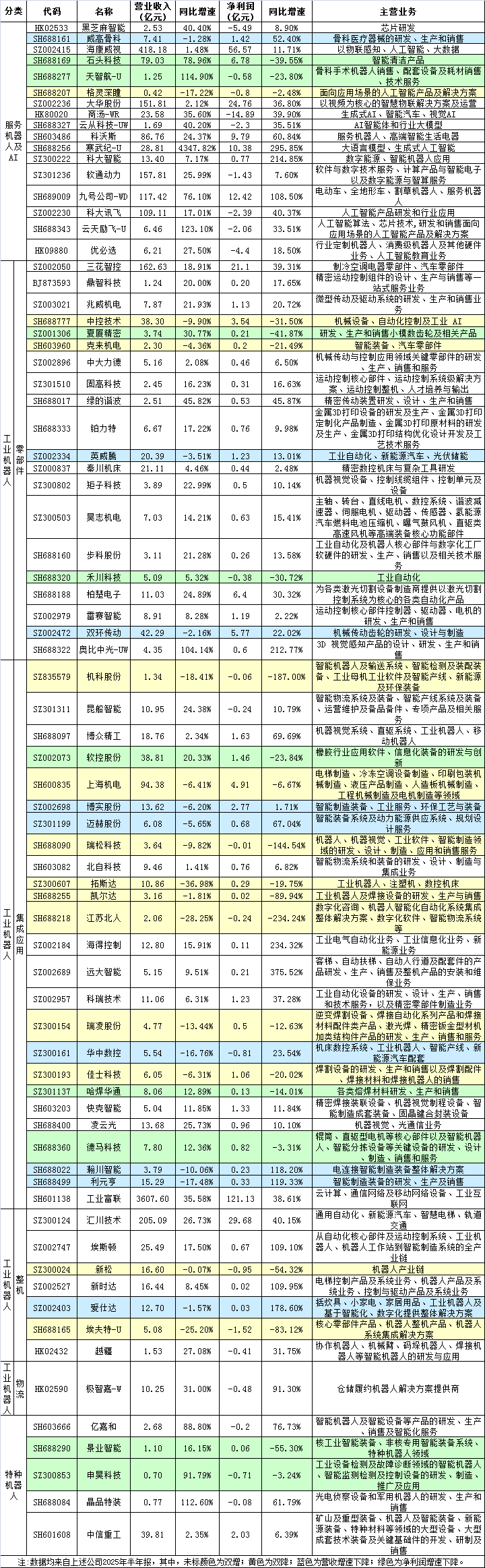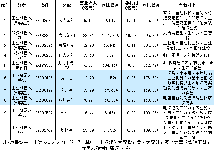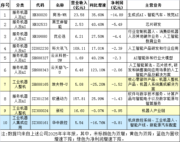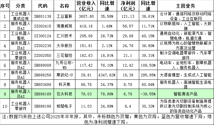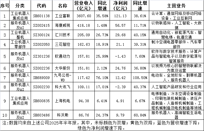 01 市場(chǎng)業(yè)績(jī)總覽 總體來(lái)看,行業(yè)整體處于一個(gè)高景氣度的上升通道中。 在已披露年報(bào)的75家上市公司中,75家公司營(yíng)業(yè)總收入5829.94億元、歸屬母公司股東凈利潤(rùn)合計(jì)300.97億元。其中,53家公司實(shí)現(xiàn)營(yíng)業(yè)收入同比增長(zhǎng),53家公司實(shí)現(xiàn)歸母凈利潤(rùn)同比增長(zhǎng);53家公司實(shí)現(xiàn)盈利,凈利潤(rùn)超過(guò)十億元的公司達(dá)到7家,凈利潤(rùn)同比增速大于100%的有11家。 02 營(yíng)收TOP 10 得益于全球AI算力基礎(chǔ)設(shè)施建設(shè)的加速推進(jìn),工業(yè)富聯(lián)以3607.6億元的營(yíng)收遙遙領(lǐng)先,其規(guī)模超過(guò)其他9家公司總和數(shù)倍,同時(shí)A股市值突破萬(wàn)億。匯川技術(shù)、三花智控、大華股份、科沃斯不僅凈利潤(rùn)可觀(20-30億區(qū)間),增速更是高達(dá)36%-60%,是兼具規(guī)模與增長(zhǎng)質(zhì)量的優(yōu)質(zhì)企業(yè)。值得注意的是,營(yíng)收前十名中的企業(yè)多數(shù)為業(yè)務(wù)多元化的綜合型制造商,如上海機(jī)電、三花智控等,其機(jī)器人業(yè)務(wù)往往并非唯一主業(yè),“主營(yíng)業(yè)務(wù)反哺機(jī)器人”現(xiàn)象仍較為普遍。 03 凈利潤(rùn)TOP 10 利潤(rùn)榜由系統(tǒng)集成/硬件制造巨擘(工業(yè)富聯(lián)、海康威視)、工業(yè)自動(dòng)化專家(匯川技術(shù)、三花智控、柏楚電子)和消費(fèi)級(jí)智能產(chǎn)品先鋒(九號(hào)公司、科沃斯、石頭科技)以及AI基礎(chǔ)設(shè)施供應(yīng)商(寒武紀(jì))共同構(gòu)成,呈現(xiàn)出“大者恒大,新星崛起!”的景象。其中,工業(yè)富聯(lián)是“雙增”典范,規(guī)模和增速并存。寒武紀(jì)4347.82%的營(yíng)收增速和295.85%的利潤(rùn)增速,反映了全球及中國(guó)在大語(yǔ)言模型和生成式AI領(lǐng)域的瘋狂投入對(duì)其AI芯片業(yè)務(wù)的巨大拉動(dòng)。 04 虧損TOP 10 商湯、黑芝麻智能、優(yōu)必選、科大訊飛等企業(yè)呈現(xiàn)營(yíng)收增速和虧損收窄趨勢(shì),一旦技術(shù)突破或市場(chǎng)爆發(fā),可能迎來(lái)價(jià)值重估。埃夫特-U、新松、華中數(shù)控是工業(yè)機(jī)器人領(lǐng)域的知名企業(yè),但本期內(nèi)陷入了 “雙降”的困境。反映了工業(yè)機(jī)器人整機(jī)和集成領(lǐng)域的現(xiàn)實(shí)挑戰(zhàn):市場(chǎng)競(jìng)爭(zhēng)白熱化,技術(shù)迭代快,業(yè)績(jī)受宏觀經(jīng)濟(jì)和下游投資周期影響顯著。 05 業(yè)績(jī)?cè)鏊賂OP 10 這份榜單的核心特征是“驚人的增速”。所有公司的凈利潤(rùn)增速都超過(guò)了100%,寒武紀(jì)甚至達(dá)到4347.82%。這通常源于兩種情形:①行業(yè)風(fēng)口帶來(lái)的巨大需求(如AI);②去年同期業(yè)績(jī)基數(shù)極低,使得本期改善顯得異常突出。榜單中工業(yè)機(jī)器人集成應(yīng)用企業(yè)占主導(dǎo)(5家),表明這個(gè)細(xì)分領(lǐng)域正迎來(lái)盈利能力的集體改善。 06 結(jié)語(yǔ):技術(shù)紅利與盈利挑戰(zhàn)并存 2025年上半年,機(jī)器人行業(yè)在AI大模型、智能工廠、自動(dòng)駕駛等新動(dòng)能驅(qū)動(dòng)下保持增長(zhǎng),但企業(yè)間分化加劇。能否將技術(shù)優(yōu)勢(shì)轉(zhuǎn)化為可持續(xù)的商業(yè)模式,已成為企業(yè)生存與發(fā)展的分水嶺。未來(lái)半年,隨著政策持續(xù)支持與市場(chǎng)需求進(jìn)一步釋放,行業(yè)有望迎來(lái)新一輪整合與價(jià)值重估。